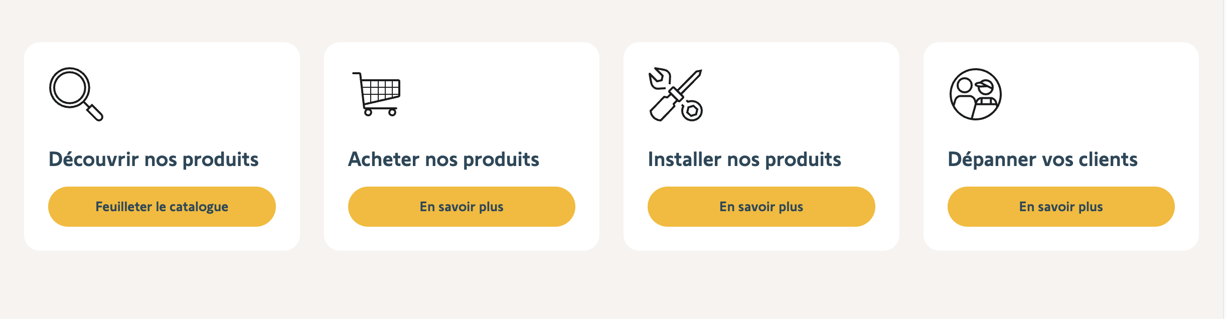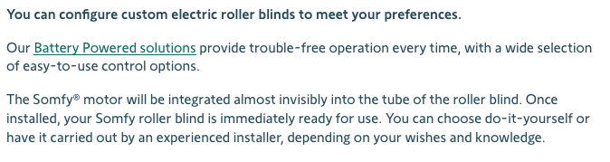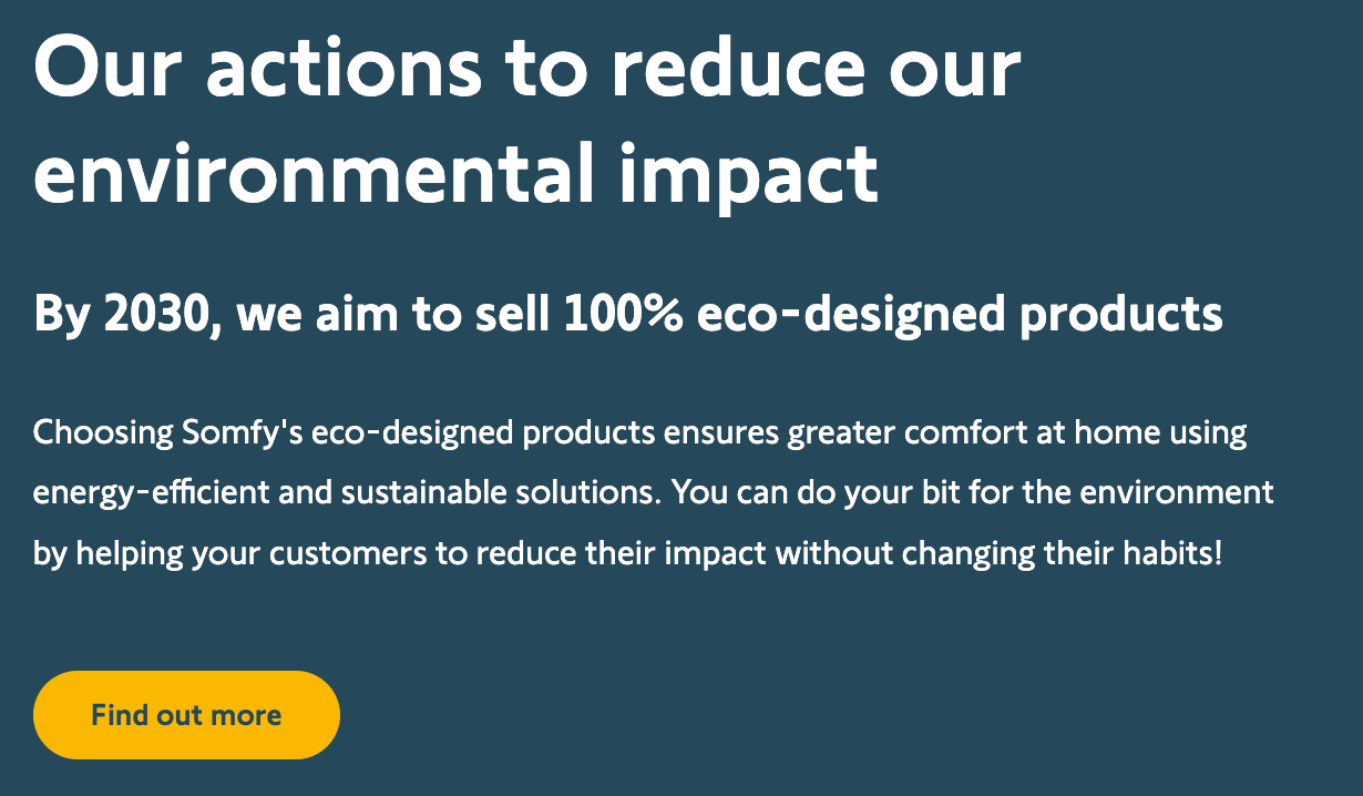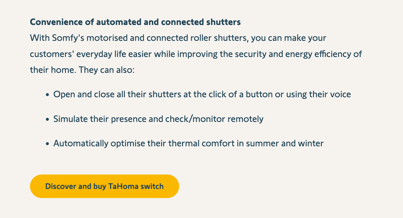 Primary CTAs are the strongest interactional element in Somfy’s websites. Therefore it should be used only a few times per page at maximum, when needed. Too many CTAs at the same level will create confusion to the user. (See Choice paradox [2])Avoid using Primary CTAs for navigational purpose. Use links or secondary CTAs for other purposes.